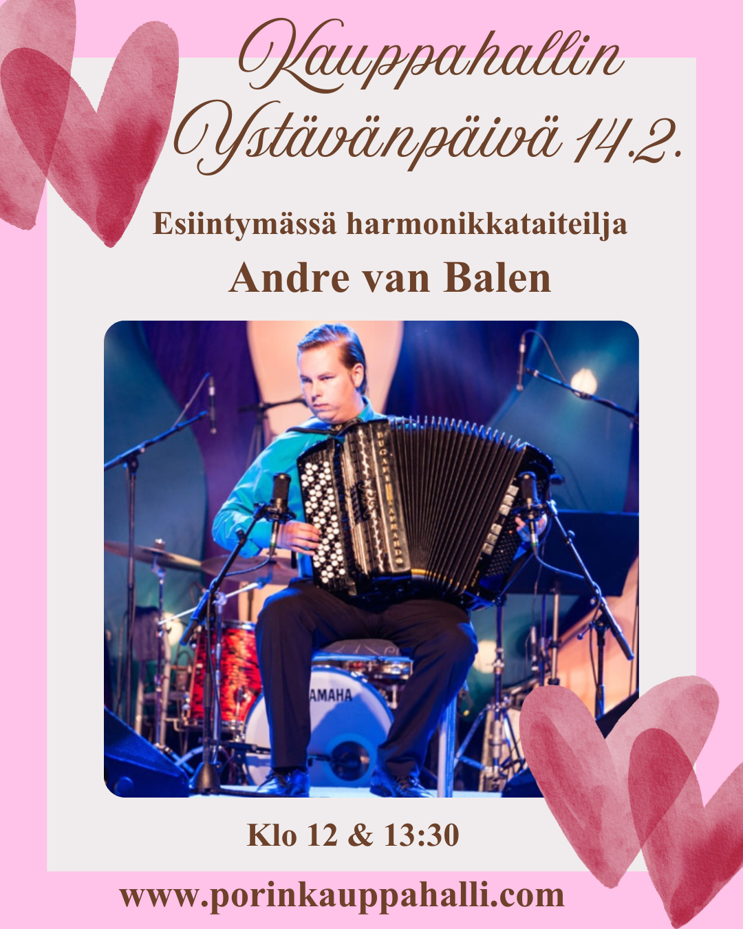 Lauantaina 14.2. hallissa tunnelmaa luomassa harmonikkataiteilija Andre van Balen klo 12 ja 13:30.
