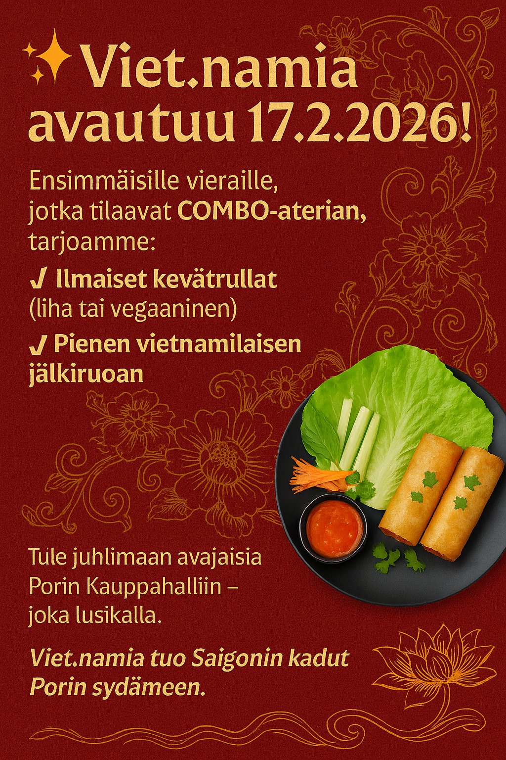 Tiistaina 17.2. aukeaa Kauppahalliin upeita vietnamilaisia makuja loihtiva ravintola Viet.namia. Tervetuloa avajaisiin klo 11.00. Viet.namia on auki tiistaina klo 11:00–18.00 tai niin kauan kuin ruokaa riittää.