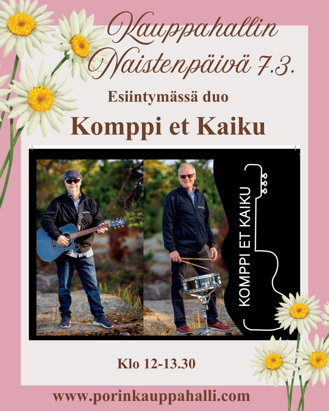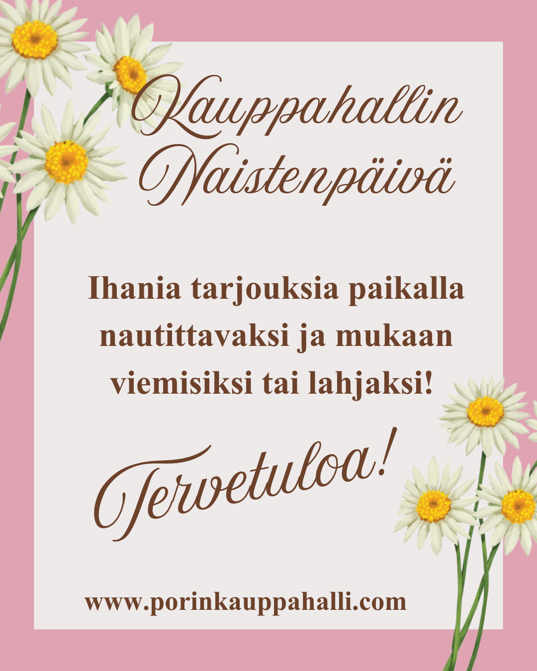 Tervetuloa viettämään Naistenpäivän viikkoa tunnelmalliseen Porin Kauppahalliin Lauantaina 7.3. ! Naistenpäivän etkot klo 10 alkaen Luvassa aivan spesiaalia teeman mukaista tarjontaa yrityksiltä ja tunnelmasta huolehtii Duo Komppi et Kaiku klo 12 eteenpäin noin klo 13.30 asti. Tervetuloa viihtymään ja nauttimaan!