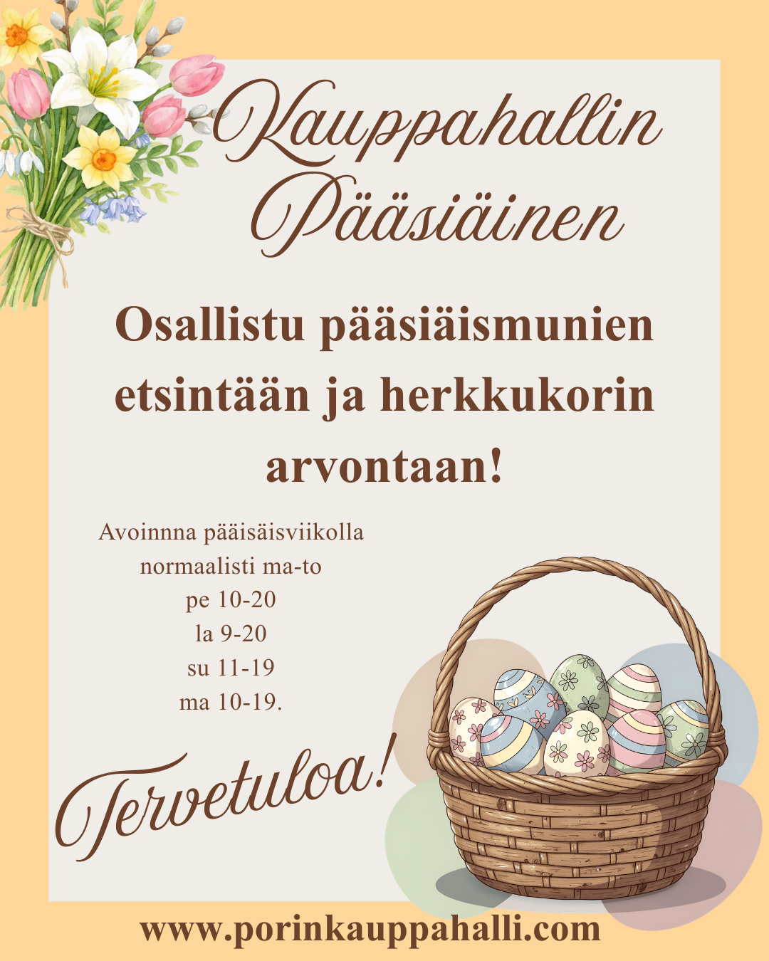 Osallistu herkkukorin arvontaan! Arvontalipukkeita täytettävissä ma-to, kori arvotaan pääsiäislauantaina. Halliin on myös piilotettu pääsiäismunia joita voi etsiä ti 31.3. ja ke 1.4.